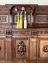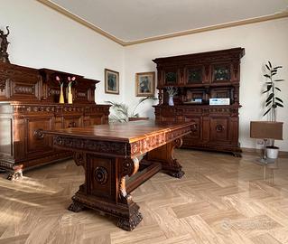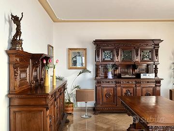 vendo arredamento sala pranzo in legno massello con intarsi pregiati e lavorazione artigianale della seconda metà del XX secolo. L’arredamente sala si compone di: - credenza d'appoggio con testata - credenza con alzata e vetrina per la cristalleria - tavolo pranzo Ambedue le credenze sono molto capienti per conservare serviti, cristalleria e quant’altro occorra per imbandire la tavola), oltre tavolo pranzo. Prezzo da concordare dopo visione. Ritiro a carico del compratore.