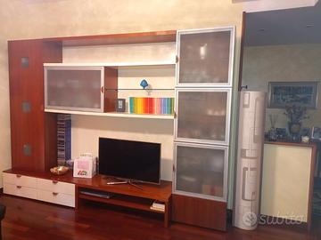 Mobile a parete per salotto con tavolinetto in vetro (misure mobile: lunghezza 3.20m, altezza 2.27m, profondità max 54cm) (misure tavolinetto: 55×100 cm)