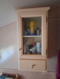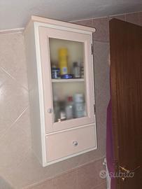 Pensile con sportello in vetro e mobile con cassetto, in legno massello, lavorati a mano, maniglie in ceramica, colore rosa e bianco.