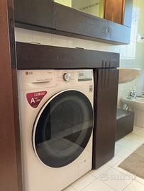 Mobili bagno contenente lavatrice ( non inclusa ) in legno massello , colore wenghè , con luci a led nella parte alta dello specchio e doppia presa a sinistra dello specchio , specchio incluso , due cassettoni porta biancheria con chiusura rallentata , armadietto porta detersivi e tre pensili porta minuterie da bagno . Misure come da disegno .Valuto offerte .
