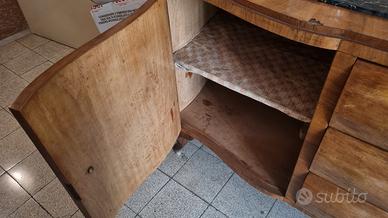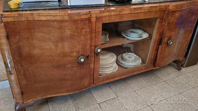 mobili buffet anni 40. topper in marmo nero. vetri integri. decorazione con cervo su anta in vetro. segni di usura come da foto. prezzo cadauno. h mobile cm 83, L cm 185, profondità cm 53 specchio cm 51 × cm 155