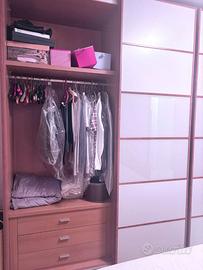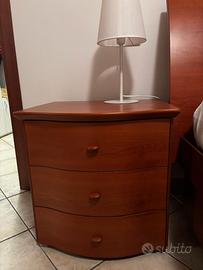 Camera da letto matrimoniale in legno massello composta da armadio ante scorrevoli misure larghezza 360 cm, profondità 62 cm,altezza 260 cm, cassettiera con 5 cassetti larghezza 125 cm, prof 56 cm, altezza 80 cm, comodini 2 con 3 cassetti larghezza 52cm, prof 46 cm, altezza 52 cm, letto matrimoniale con cassone e spalliera larghezza 165,5 cm, prof 220 cm, altezza testata 95 cm, altezza base cassone 36 cm. Vendibile anche a pezzi separati.