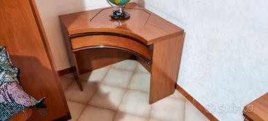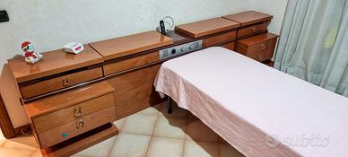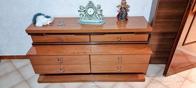 Camera da letto completa in legno colore noce, composta da armadio a ponte con specchio centrale, comò/cassettiera e mobiletto angolare. Linee classiche, finitura lucida, mobile capiente e ben tenuto, ideale per arredare una camera in stile tradizionale.