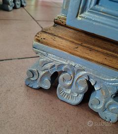 Comodini, specchio, cassettiera e cassapanca antichi in legno intarsiato, trattato e verniciato in azzurro carta da zucchero.
