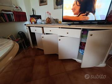 Vendesi come in foto camera da letto così composto : 2 comodini a tre cassetti con ripiano in marmo rosa, armadio a sei ante con specchio e quattro cassetti, canterano con ripiano in marmo rosa e sei cassetti, specchio da camera e giro letto, colore avorio laccato.