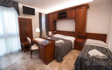 Mobili in legno massello, stile classico, colore ciliegio. La camera è composta da: armadio ponte per letto matrimoniale, attaccapanni con poggiavalige, scrittoio con vano frigobar, specchio da parete, 2 sedie imbottite ignifughe.
