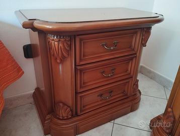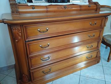 La vendita comprende: un armadio a 6 ante con quattro cassetti e due specchi incorporati, in perfetto stato; due comodini con tre cassetti ciascuno, in perfetto stato; un mobile cassettiera compreso di specchio, tre cassettini piccoli e 4 cassettoni (questi ultimi necessitano di riparazione).