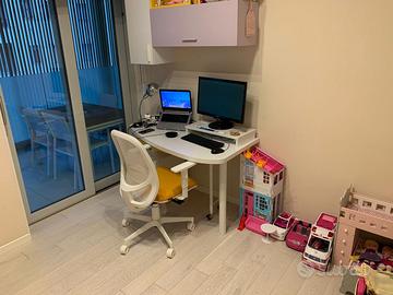 • Scrivania bianca stondata (L 135 cm) con scrittoio giallo estraibile (salvaspazio).