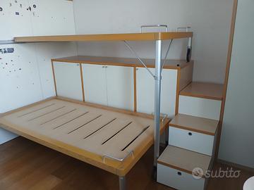 vendo per inutilizzo mobili in legno camera per bambini composti da 2 letti sovrapposti scorrevoli, mobile contenitore a 4 ante, scaletta con cassetti, pannelli bianchi a muro per il sostegno. Forme e colori come da foto. Pannelli a muro cm 300, mobile più scala cm 260, letti cm 100x200, armadio cm 210x60x104h. Il tutto con supporti in acciaio originali. Vendo a pezzi smontati e segnati con foto per il montaggio.