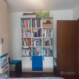 Cameretta con armadio ponte con due letti singoli (compresi eventualmente le reti e i materassi) e mobile libreria. Dimensioni: - armadio ponte H 261 cm, L 334 cm; profondità 56 cm. - mobile libreria H 231 cm, L 135 cm, profondità 35 cm.