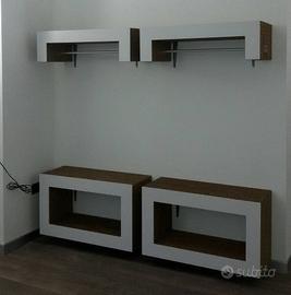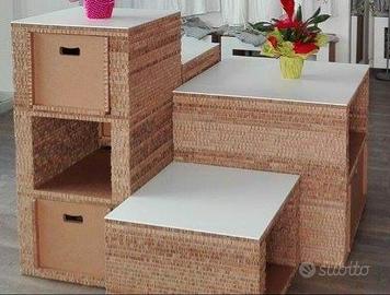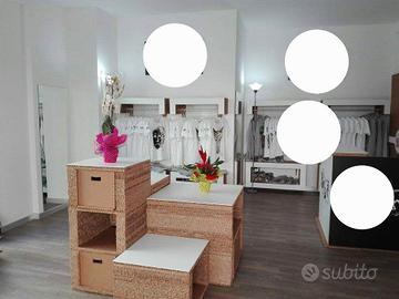 Causa inutilizzo per cessata attività vendo arredamento completo, utilizzato 6 mesi, in cartone pressato ecologico, a nido d'api, design moderno, componibile e modulabile, adattabile per piccoli e grandi spazi, composto da 8 mensole appendiabiti, 8 quadrangolare, 8 isole di 4 grandezze con cassettiera, 2 librerie, 1 bancone-cassa.