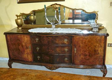 Set completo in radica modello "CHIPPENDALE " inizi del '900,mobile con specchiera a 5 ante +mobile con specchiera a 2 ante e 3 cassetti+ tavolo con 6 sedie rivestite in vera pelle,prezzo trattabile contatto telefonico solo se interessati da contatto in chat