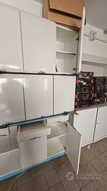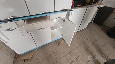 mobili cucina anni 60 in legno e formica 1 pensile scolapiatti con chiusura scorrevole, viziata ma funzionante. 2 pensili a 3 ante con ripiani. 1 mobile con piano celeste/verde acqua con 3 cassetti e 3 ante e ripiani. 1 tavolo con cassetto e spianatoia. 4 sedie. Tutto in buono stato con parti scollate e alcune mancanze, ma piccole. prezzo di realizzo. Ps ho altro mobile bar vittoriano in annuncio