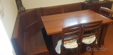 arredamento cucina composto da tavolo in legno cassapanca ad angolo 3 sedie, vetrinetta e mobiletto