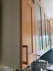 Pensile scolapiatti due sportelli legno-vetro, altro pensile con sportello legno e vetro, pensile angolare 60x60, tutti alti 90 cm circa.