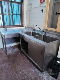 Vendesi mobili per cucina in acciaio, nello specifico: un cuoci pasta-fornello-friggitrice, una cappa per aspirazione con relativi tubi, una lavastoviglie, due mobili per lavaggio, un mobile pensile, un lavandino lavamani completo di rubinetteria, un contenitore per l'umido, un tavolo, un forno elettrico e due spinatrici una per birra ed una per l'acqua. In buono stato come si evince dalle foto allegate. Prezzo da concordare. Pagamento e ritiro in loco. Valutazione anche per eventuale disponibilità di spedizione previo accordi.