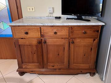 Arredo cucina in stile della Nonna marca Patriarca, cucina 4 fuochi con forno ad incasso e cappa a caminetto; lavello 2 vasche con gocciolatoio e scolapiatti con sportello basculante; vetrina 3 ante e madia 3 ante e cassetti; tavolo e 4 sedie impagliate. Forno elettrico usato pochissime volte, tutti i ripiani sono in marmo lucido bianco carrara. RITIRO E TRASPORTO A CURA E CARICO ACQUIRENTE