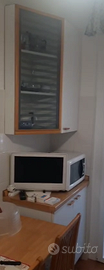 La cucina è lunga 3 metri ed è composta dai seguenti moduli: modulo lavastoviglie (non compresa) da 60 cm, modulo lavandino da 90cm, lavandino con doppia vasca e scolo a sinistra, modulo da 45 cm con 2 cassetti piccoli e un cassettone, modulo da 60 cm con piano cottura e forno funzionanti (il piano cottura ha l'accensione rotta), un modulo terminale con sportello obliquo da 45 cm e pensili corrispondenti alti. Il pensile terminale è obliquo con vetrina e cornice in legno. Sono compresi la cappa e il lavandino, è escluso il rubinetto. Ci sono poi un pensile da 45 e un terminale obliquo da 45cm con vetrina. La cucina è già smontata.