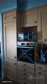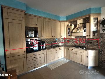 Cucina tenuta benissimo e in ottime condizioni, come da foto. Altezza totale 250 cm, profondità base 60 cm e altezza da terra di 85 cm, altezza pensili 112 cm con una profondità di 35 cm. Piano Top in granito Juparanà sp. 3 cm con bordo arrotondato, ante in vero legno (no truciolare) lavello Franke in ac. inox. Gli elettrodomestici (frigorifero, forno, forno a microonde, lavastoviglie, il piano cottura e il rubinetto miscelatore) NON sono compresi. La cucina sarà disponibile per lo smontaggio nei primi 14 giorni di maggio 2026; smontaggio, trasporto e rimontaggio a cura dell'acquirente. Per altre foto e misure, contattatemi. Sopralluogo solo se veramente interessati, no perditempo o piazzisti. Richiesta caparra confirmatoria e pagamento con bonifico istantaneo/contanti. Prezzo leggermente trattabile.