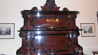 Coppia di importanti mobili da sala in radica con filettatura in legno nero, entrambi databili alla metà dell' '800 , assolutamente in perfetto stato non bisognosi di alcun restauro. Le dimensioni sono rispettivamente: per la piattaia 1,58X2,35 , per la credenza 2,09X1,0 , la profondità è per entrambi di 50 cm.