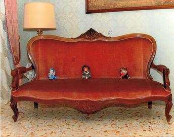 Divano antico 3 posti – struttura in legno massello, rivestimento color rosso/bordeaux.