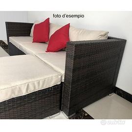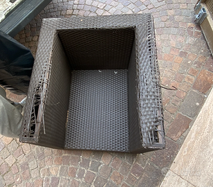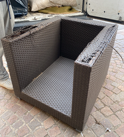 Set lounge completo da esterno composto da due divani, 4 poltrone, 4 poltrone angolari e due tavolini bassi. Alcuni degli articoli risultano danneggiati in vari punti, ad esclusione delle poltrone angolari che sono intatte. Le strutture interne invece sono integre e resistenti, perfetta come base da rivestire o pannellare. I cuscini non sono in dotazione.