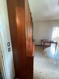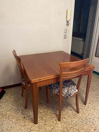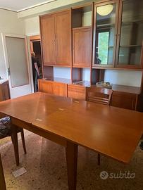 Composizione da sala composta da credenza, cassettiera e un tavolo, allungabile, con 6 sedie. Misure credenza L 2,52 m H 2,36 m P 57 cm. Misure cassettiera L 1,61 m H 86 cm P 52,5. Misure tavolo quadrato 1 m, allungabile 1 m per 2 m.
