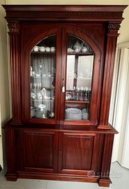 Credenza in legno massello di mogano, creazione artigianale con sculture stile impero. Tavolo in vetro con supporto di colonne in gesso più sedie.