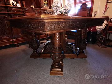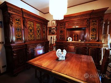 Sono disponibili due mobili adatti a studio o sala da pranzo con tavolo allungabile con due prolunghe e 8 sedie. Si presume che possa essere del periodo fine 800 inizio 900.