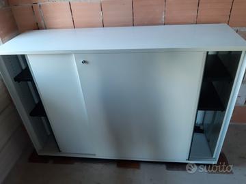 Blocco mobili da ufficio composto da 2 armadi grandi, 2 armadi, medi, 2 armadi piccoli, 1 cassettiera da terra e 2 da appoggio, 4 tavoli (anche allungabili) 1 tavolo da disegno completo di tecnigrafo. Disponibili anche sedie in buone condizioni. I pezzi sono vendibili anche singolarmente.