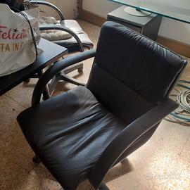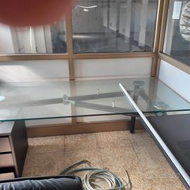 Scrivania in cristallo componibile, 2 cassettiere, poltrona e scaffale in metallo.