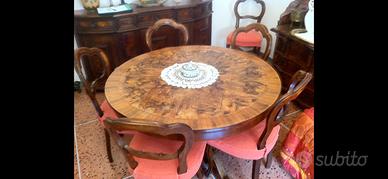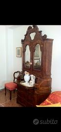 Vendo sala completa composta da credenza bassa, credenza con specchio e ribaltina, tavolo rotondo con 6 sedie. Tutti gli elementi hanno intarsi in radica e risalgono a produzione di metà anni 80 a Cerea. Stato di conservazione piu che buono. Ritiro a carico dell’acquirente.