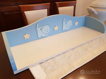 VENDO MOBILI COORDINATI PER CAMERETTA BAMBINO, COLORE CELESTE E BIANCO: - CASSETTIERA - LETTINO COMPRENSIVO DI CASSETTONE E MATERASSO - APPENDIABITI - N.2 MENSOLE, UNA CON CONIGLIETTI E UNA CON GATTINI TUTTO COORDINATO E IN OTTIME CONDIZIONI, COME DA FOTO, MARCA MIBB.
