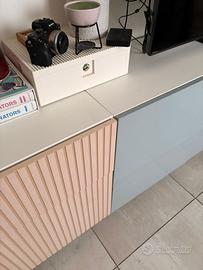 Mobili Ikea Besta 2 moduli: - modulo blocco singolo cassetto e anta legno rosa 60x40x74 con gambe in metallo - modulo blocco triplo 3 cassetti e 3 ante grigio azzurro lucido 120x40x74 con gambe in metallo Mobili in ottime condizioni. In regalo altre ante grigio/azzurro e legno rosa per cassetti. Vendesi per cambio mobili.