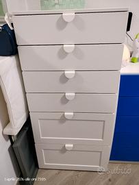 Set composto da: - armadio a 4 ante con aste appendiabiti interne - cassettiera da 6 cassetti con chiusura rallentata, completi di maniglie - mobile fasciatoio evolutivo, si trasforma in scrivania riposizionano il piano superiore Mobili usati negli ultimi 4anni, ma in ottime condizioni. Ritiro a domicilio (Grugliasco (TO))a cura di chi acquista, i mobili sono attualmente montati.