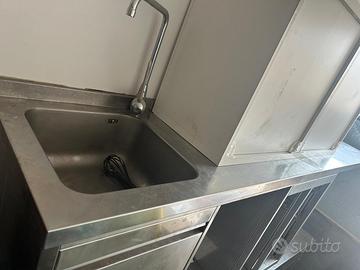 tavolo refrigerato 4 ante, forno smeg, tavolino singolo, lavandino con appoggio e cassetti , mobile macchina da caffè con cassetto , cappa lineare semplice, 2 pensili a parete, inoltre un freezer a pozzetto quest'ultimo non in acciaio.