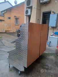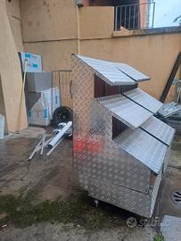 vendesi n2 strutture in ferro e piani espositivi in alluminio zigrinato .dotati di ruote con fermi e maniglie posteriori x trasporto..buono stato adatte x negozi di frutta e verdura e non solo..