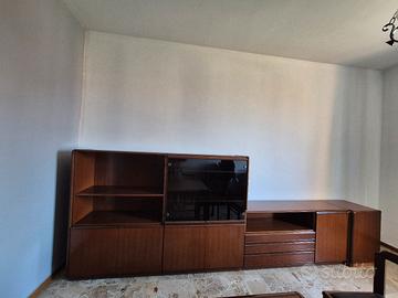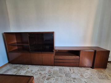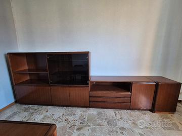 composizione mobili in legno pregiato per soggiorno composto da 2 moduli alti con ripiani e cassetti ed annessa vetrina con vetro oscurato + 3 moduli bassi contenitivi