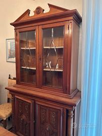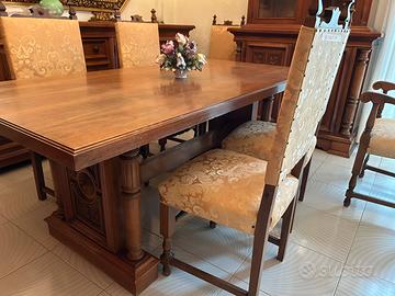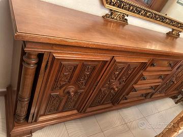 Vendo splendido set di mobili in legno dalle tonalità calde, ideale per chi desidera arredare la casa con eleganza e la solidità di un tempo. Tutti i pezzi fanno parte di una collezione coordinata e sono stati conservati con estrema cura: il legno è sano e le finiture sono impeccabili. È una soluzione perfetta per chi vuole completare un salone o una sala da pranzo con mobili di qualità, pronti per essere subito inseriti in una nuova casa. Il set comprende: Imponente Madia (L 312 cm): Un mobile contenitore di grande fascino con ante riccamente scolpite a rilievo. Credenza con vetrata: Elegante mobile a doppio corpo con vetri lavorati a losanghe, ideale per esporre i servizi più belli. Tavolo e 5 sedie: Un tavolo robusto con basamento artistico intagliato e sedie coordinate con schienale alto in tessuto damascato dorato. Grande Specchiera: Cornice ottagonale dorata con motivi floreali, perfetta per dare luce e profondità alla stanza. Mobile Porta TV: Funzionale e solido, con vano a giorno per i dispositivi e ante inferiori decorate. Vetrinetta a due ante: Un grazioso mobile espositivo con i classici piedini a cipolla. Dimensioni principali (in cm): Madia: L 312 – H 106 – P 52 Credenza Alta: L 135 – H 238 – P 51,5 Tavolo: 195 x 95 Specchiera: L 197,5 – H 113 Vetrinetta: L 97 – H 113 – P 47 Prezzo per l'intero blocco: 600€ Ho fissato un prezzo di realizzo, trattabile, per favorire una vendita rapida e l'acquisto in blocco unico. Ritiro: I mobili si trovano a Bari. Il ritiro e il trasporto sono a carico dell'acquirente. Data la solidità dei pezzi e la lunghezza della madia (oltre 3 metri), è consigliato l'uso di un furgone capiente. Sono a disposizione per ulteriori foto o per fissare un appuntamento per visionarli dal vivo.