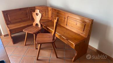 Vendo set mobili il legno massello comprensivo di pensili panca angolare con spazi di stivaggio e 2 sedie come da foto. In ottime condizioni.