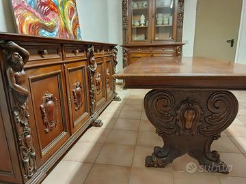 -Credenza a quattro ante con ampi cassetti e figure scolpite 245 x 102 x 51cm