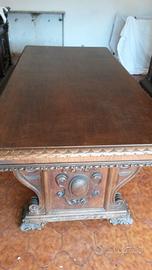Mobile e contro mobile da sala in stile rinascimento piemontese in noce massiccio del primo 1900 con tavolo e 6 sedie.