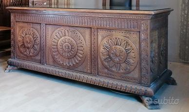 I mobili sono intagliati su legno massello e ben conservati, le scrivanie hanno il piano d'appoggio ricoperto dal vetro. Posso consegnare nelle provincie limitrofe. Misure: Libreria L. 190 H. 183 P. 50, scrivania grande L. 166 H. 82 P. 86, scrivania piccola L. 123 H. 82 P. 75, attaccapanni L. 90 H. 170 P. 22, tavolino dattilo L. 100 H. 70 P. 53, sedia con braccioli L. 60 H. 113 P. 63, 2 sedie L. 48 H. 102 P. 44.