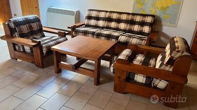 Divano letto con 2 poltrone e tavolino (78x78 cm), una delle due poltrone presenta il rivestimento del cuscino della seduta danneggiato.