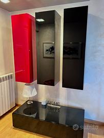 3 colonne pensili verticali in legno laccato (2 nere, 1 rosso rubino)