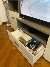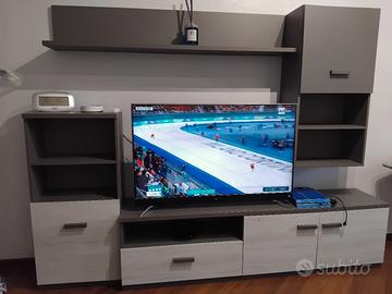 vendo mobili parete soggiorno stile moderno colore grigio scuro e bianco con venature effetto legno.