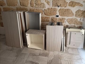 I mobili si presentano bene (qualche sbeccatura in zone non visibili), ottima fattura (realizzati in Brianza), ante laccate lucide colore crema, struttura grigio chiaro con venature sfumate.