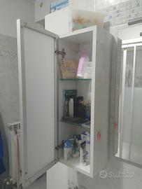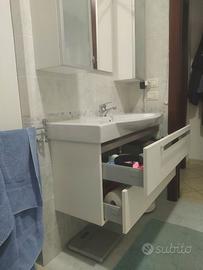 Causa ristrutturazione vendo, come da foto, lavello completo di mobile sospeso con due cassettoni, coppia di armadietti e specchio completo di faretto. Il lavello presenta dei segni ma non ci sono crepe. Le misure sono le seguenti: lavello con cassettoni cm 99x38 la parte più stretta cm 48 la parte più larga alto cm54. Misure armadietti: altezza cm 72, larghezza cm 25, profondità cm 20. Infine lo specchio con le seguenti misure: 68 x 52. Prezzo leggermente trattabile. Telefonare ore pasti o messaggio su Subito. Samuele.