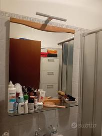 Prezzo da concordare / trattabile. Mobile bagno illuminato in legno e cristallo con pensili a corredo come da figura, formato da : 2 specchi per bagno con lampada e penisola in cristallo misure 70x85 1 armadietto portaoggetti con inserti in cristallo 85x35 1 portasalviette con inserti in cristallo misure 200x35 Tutto gia smontato e pronto dopo il 15 gennaio Articoli vendibili anche separatamente