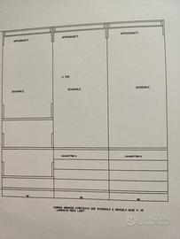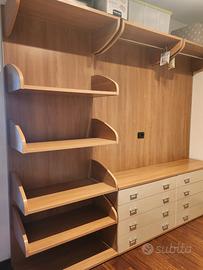 1 lato composto da 3 moduli larghezza 90cm l'uno, dotata di 1 cassettiera, 2 vani portascarpe e 5 vani appendi abiti o da adibire a mensole.
